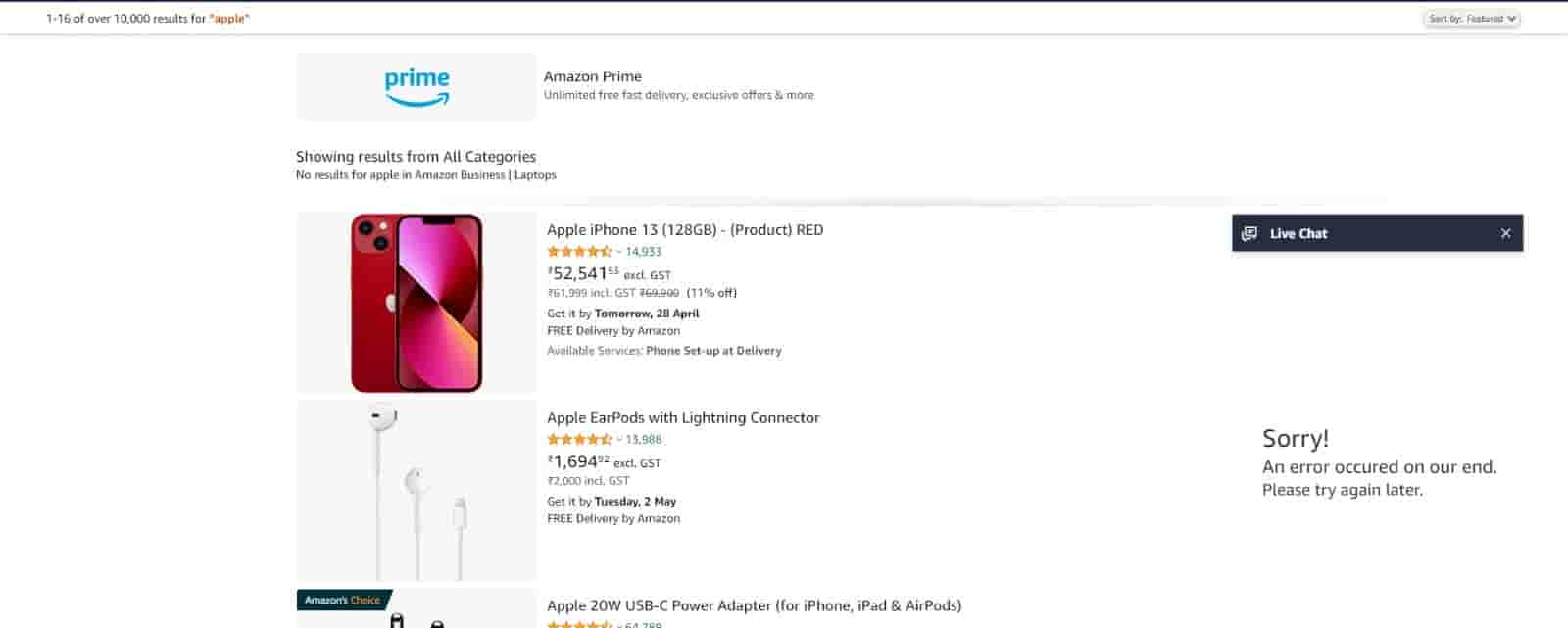 While looking for a product on Amazon we came across a new feature that blew our mind for a moment. This new feature is a Live Chat feature appearing at the bottom right corner of the Amazon webpage. This new feature appears with the message “Need help finding the right product? Chat with Live Assistant”. We tried to use this new interesting feature but it appeared with the message “ Sorry! An error occurred on our end. Please try again later.”